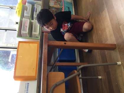 4歳児は5歳児の貼ったマークを見て、なぜ危ないのかを考えていました。「ピアノは指を挟んだら痛いから危ないんだ」「テラスは走ったらあかんもんね」と色々な声が聞かれました。