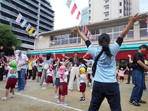 1学期の親子まつりで登場したミャクミャク(保護者作)や手形国旗も会場で子どもたちを応援してくれてました。小学校や中学校の校長先生や地域の方々にも応援していただき、子どもたちはとても嬉しい気持ちでいっぱいです。また一段とたくましく大きくなりました。