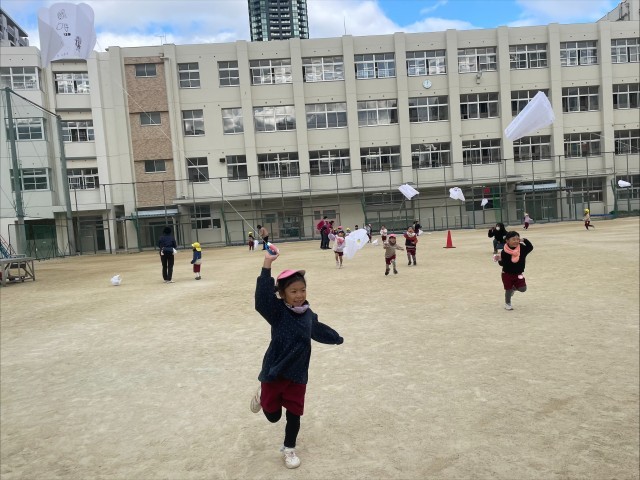 凧上げを楽しみにしていた子どもたちの気持ちをいっぱい乗せて、凧は勢いよく空高く上がりました。