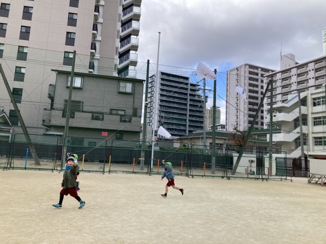時間いっぱいそれぞれに凧上げを楽しむことができました。常盤小学校のみなさま、グラウンドをお借りさせていただきありがとうございました。