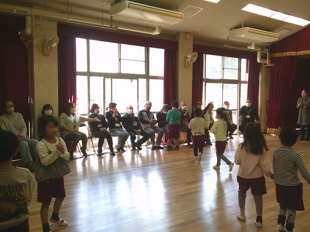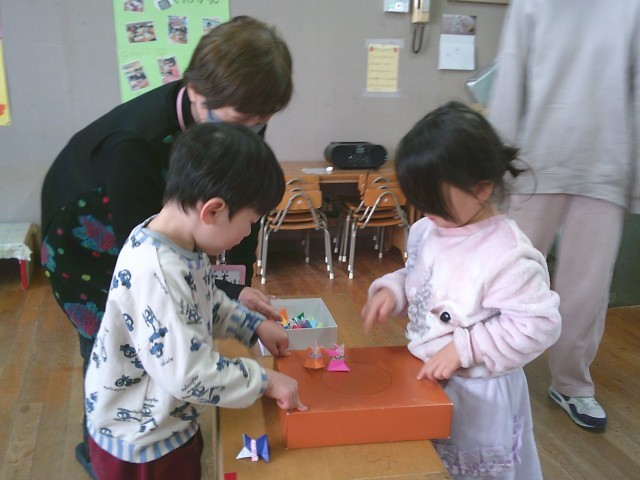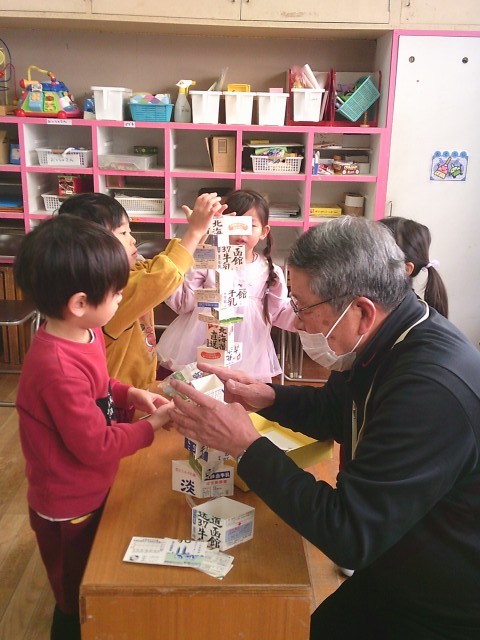 4歳児は、手裏剣の的あてや牛乳パックタワー、トントンすもうで遊びました。地域の方々が優しく遊び方やコツを教えてくださり、じっくりと関わって下さいました。最後にホールに集まり、地域の方々にお礼の歌やペンダントを渡し、「また、幼稚園に遊びに来てください」と、花道を作ってお見送りしました。