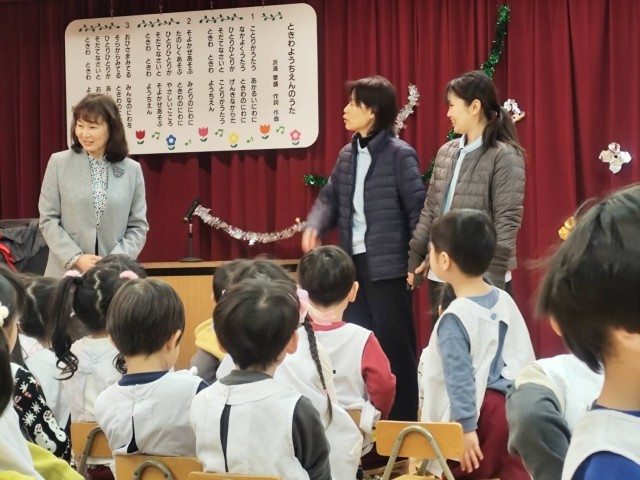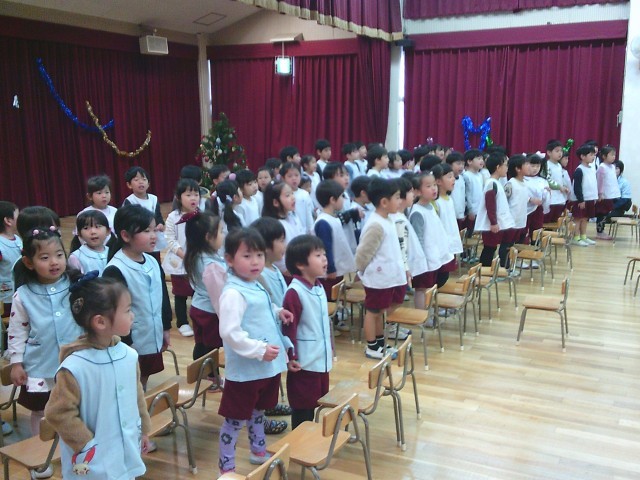 終業式では、園長先生から冬休みのお約束の話を聞いたり、先生たちの劇「電子機器の約束・外でいっぱい遊ぼう」を見たりしました。保護者の方に、園歌と「あわてんぼうのサンタクロース」も聞いてもらいました。