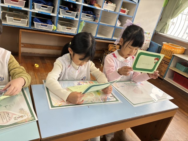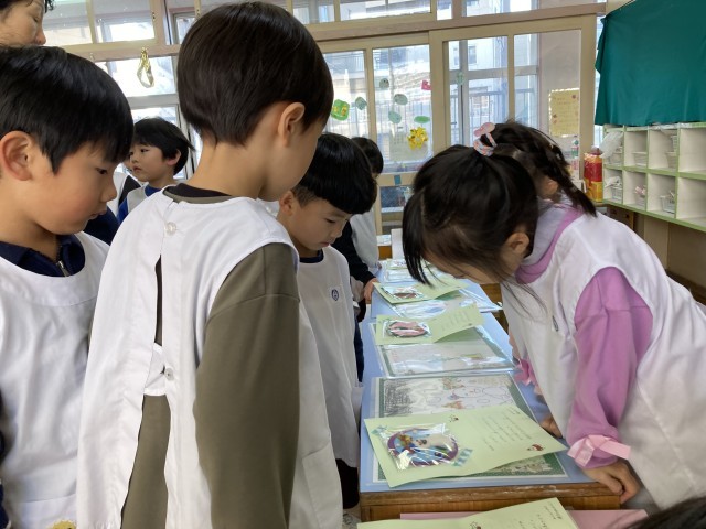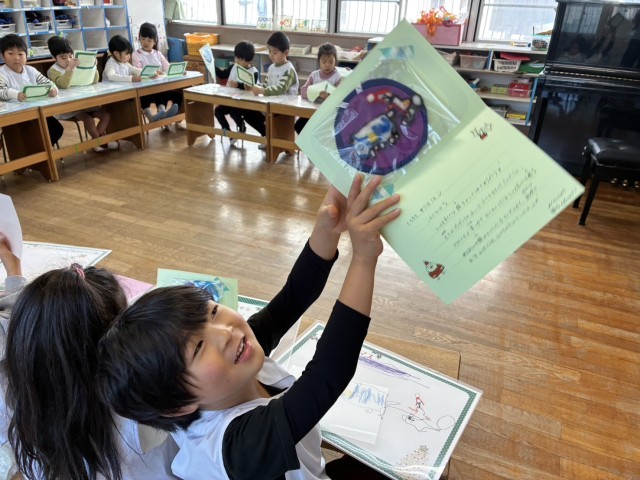 終業式、自分のかいた絵が、素敵なオーナメントになっていることに、大喜び!縁活のみなさんが、心を込めてオーナメントにしてくださったことを、クラスのみんなで喜びました。もう1つのオーナメントが病院に飾られていることを伝えると、嬉しそうにしていました。