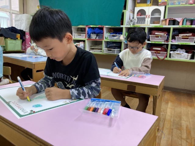 クリスマスを病院で過ごす、お友達のことを思いながら、「プレゼントを描こうかな~」「サンタさんもいいね」と、一人一人が思いを込めて、クリスマスの絵をかきました。