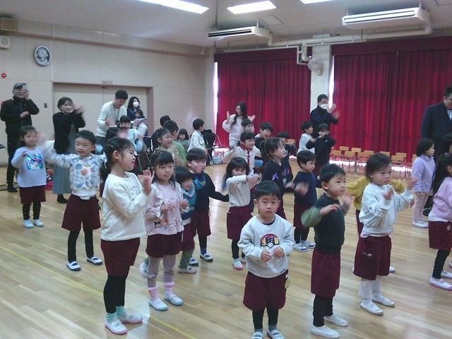 季節の歌では、冬休みが明けて風邪が増えるこの時期だからこそ、みんなで風邪に気を付けて元気に過ごそうという思いも込めて「コンコンクシャン」を歌いました。そして保護者の方も一緒に、いろいろな動物のコンコンクシャンを真似して楽しみました。