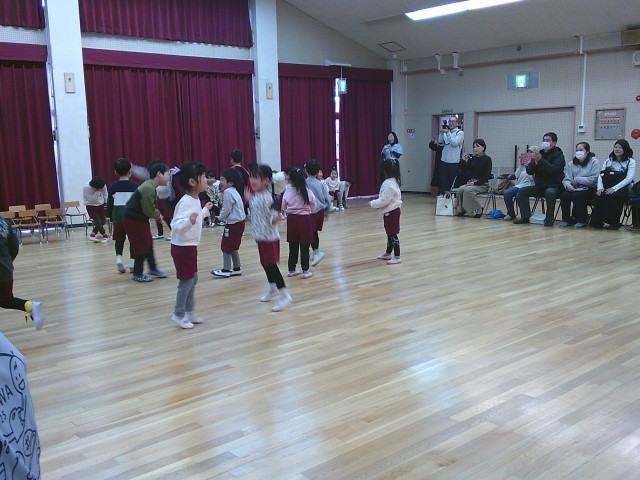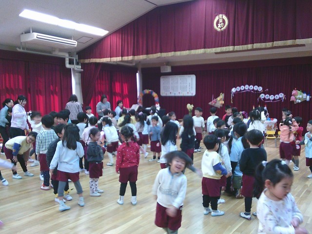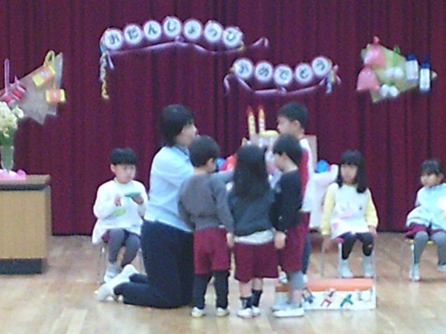 2月生まれのお友達の誕生会をしました。ひよこ組さんの劇『ノンタンのたんじょうび』に出てきたケーキが登場したり、誕生児の入場では、もり組がピアノに合わせて楽器を鳴らして盛り上げてくれました。園長先生から誕生ブック、はな組からは「うさぎのキラキラしゃかしゃかペンダント」のプレゼントをもらいました。今年度の誕生会の恒例になっている、保護者からの歌のプレゼントは『ゆきのぺんきやさん』とっても素敵な歌声に、子どもたちも聞き入っていました。誕生児の自己紹介も自信をもって言う姿に、職員も保護者の皆さんも子どもたちの成長を感じることができ、嬉しかったです。そら組さんが生活発表会の劇の中で踊った「鬼のパンツ」を披露してくれて、その後みんなで踊り、ちびっこ鬼がいっぱいのホールは大盛り上がりでした。