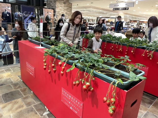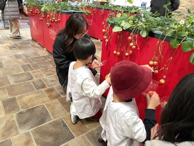 保護者の方と手をつなぎ招待された場所へ到着すると、いちご畑がハルカスタワー館7階の一角に広がっていました。