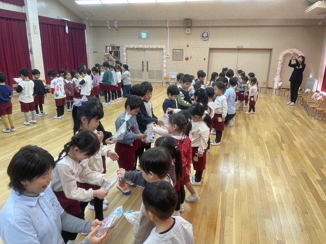 その後は年少・年中児から心を込めて作ったプレゼントを渡すと、「かわいいね」「ありがとう」と年長児が伝えてくれて、みんなニコニコ嬉しそうでした。最後にはお互いの顔を見ながら歌を歌い、"ありがとう”の気持ちを伝えあいました。