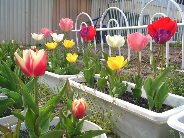 幼稚園では、桜がきれいに咲いています。色とりどりのチューリップも可愛らしく咲いていますよ。