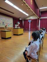 全員元気に登園しました! みんなで園長先生のお話を聞いているところです!