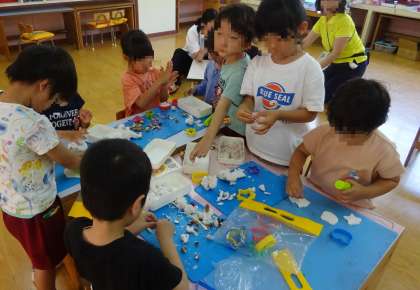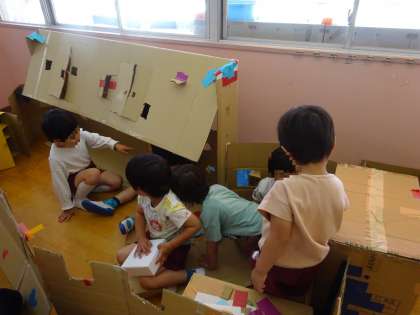 お弁当を食べ終え、おなか休めをすると、子どもたちは、いろいろな遊びを楽しんでいます。今日は、ばら組さんが、まつ組のお部屋に来て、一緒に粘土をしたり、ソフト積み木で家をつくったりしていました。ばら組は、まつ組がつくった段ボールハウスに興味をもち、段ボールハウスで遊ぶ姿も見られました。異年齢での関わりを大切にしていきたいと思います。