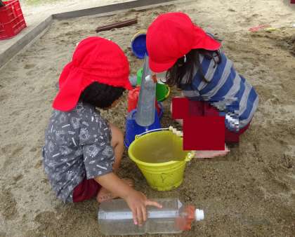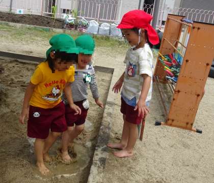 園庭では、裸足になり、泥んこ遊びを楽しんでいます。樋に水を流したり、穴を掘ったところに水をためたり、泥団子をつくったり…いろいろな遊びをしていますよ。「気持ちいいな〜」と、水や泥の感触を味わう姿が見られました。