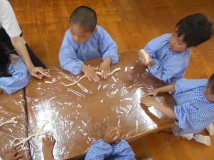 こねてできた形を見て、ドーナツみたい!これは恐竜の足跡だよ!と自分なりに