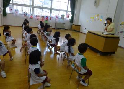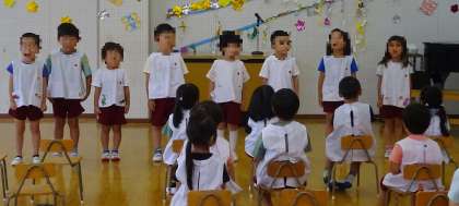 今日は、1学期終業式をしました。楽しかったことを子どもたちに聞いてみると、「遠足に行ったこと!」「スケーターでいっぱい遊んだよ」「プール楽しかった」など、たくさんお話してくれました。式の中では、まつ組が『ヤッホッホ夏休み』、ばら組が『みずあそび』の歌を、お家の方に聴いてもらいました。元気な歌声でしたね。
