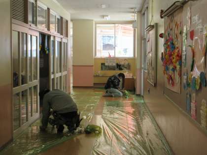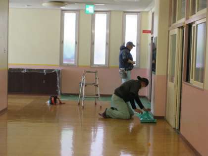 学校園営繕園芸事務所の5名の皆さんが、遊戯室・廊下・玄関の壁面にペンキを塗り、きれいにしてくださっています。