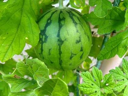 今日から8月になりました。暑い日が続いていますが、元気に過ごしていますか?園庭の畑には、可愛い小玉スイカができていましたよ。園庭の野菜やお花たちも元気にしています!
