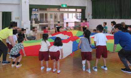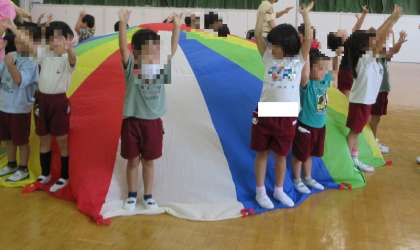 まつ組、ばら組で大好きなパラバルーンをしました。今日は、新しい技にも挑戦しましたよ。技のタイミングも少しずつ、合うようになってきています。次はどんな技に挑戦してみようかな…と、先生たちも楽しみです。