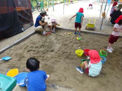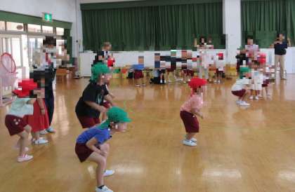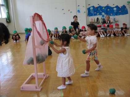 今日は、いちごクラブがありました。園庭や遊戯室で遊びましたよ。みんなで『ワイワイ運動会』の体操をしてから、玉入れをしました。たくさん玉が入って嬉しかったですね。また、遊びに来てくださいね!