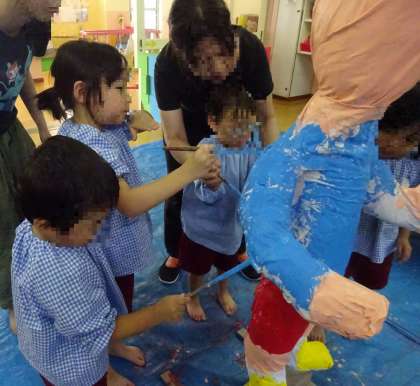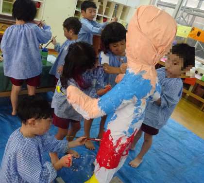 住吉かかしプロジェクトの取組の一つで、かかしづくりをしました。まつ組、ばら組みんなで一緒に絵の具で色を塗りましたよ。「お米を守ってもらおうね」と、つぶやく様子も見られました。どんなかかしになるのか楽しみですね。