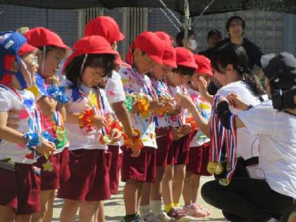 最後は、担任の先生から金メダルをもらい、「本物やな!」「キラキラや」と、大喜びでした。