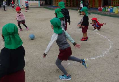 園庭では、転がしドッジボールを楽しむ姿が見られます。ボールにあたらないように、避け方も工夫していましたよ。まつ組は、ばら組に遊び方を教える姿もありました。また、みんなで遊びましょうね。