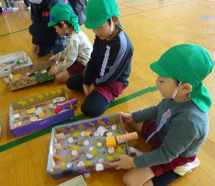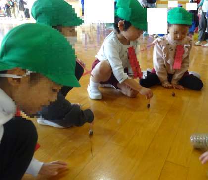 おもちゃランド(粉浜小学校)で遊んだよ 公開日 2024/12/03 更新日 2024/12/03 お知らせ 今日は、まつ組が粉浜小学校の1年生から招待状をもらい『おもちゃランド』に行きました。1年生の手作りおもちゃでたくさん遊ぶことができ、子どもたちも大喜びでした。帰るときには、手作りの名札とドングリをプレゼントしてもらい「ドングリの迷路をつくって遊びたい!」と、話す様子も見られました。たくさん遊べて嬉しかったですね。 いいね(0)