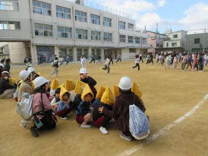 園庭へ避難した後、粉浜小学校に安全な道を通って移動しました。