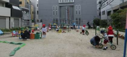 新入園のばら組の子どもたちは、まつ組と一緒に春の園庭で伸び伸びと遊んでいました。