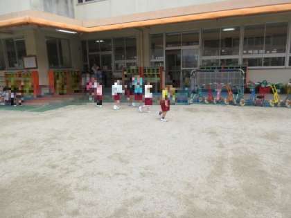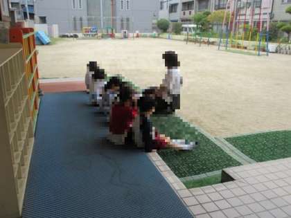 ばら組は、まつ組の避難する様子を、テラスに座って見ていました。