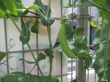 白いお花が咲いて、かわいいスナップエンドウができました。