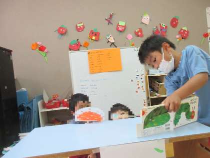 話し合いの時に途中までできた「あおむし劇場」をクラスの友達に見てもらうと、見ている友達から「すごいね」と言ってもらい、とても嬉しそうにしていました。