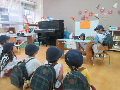 自分たちで役割分担をして、歌に合わせてつくったペープサートを動かしています。