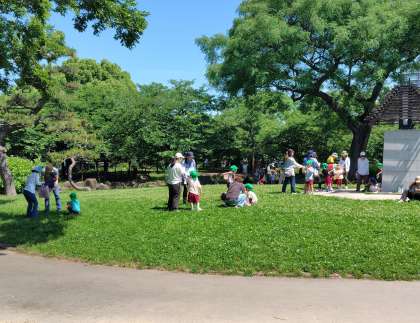 シロツメクサを見つけてブレスレットや指輪にしたり、池でコイやアメンボが泳いでいるのを見つけたり、長縄とびに挑戦したり、バルーンで遊んだり…。