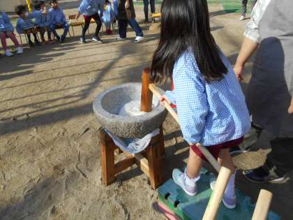 12月におもちつきをしました。みんなで力を合わせておもちをついて、手で丸めて、立派なかがみもちができました。おうちに飾ってよいお年を迎えてくださいね。