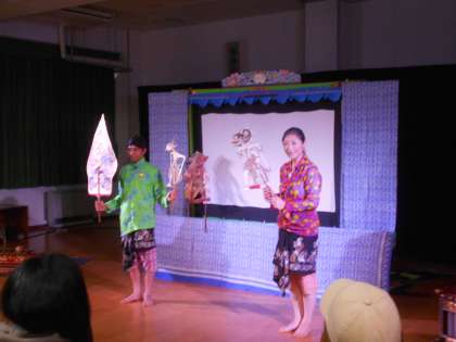 幼稚園にインドネシア人形劇団の方に来ていただき、インドネシアの伝統影絵と音楽を楽しむ「インドネシアの影絵芝居をやってみよう」を開催しました。ベストセラー絵本「きんぎょがにげた」ほか2作品をインドネシア伝統影絵の手法とガムラン生演奏で楽しみました。迫力ある音楽とスクリーンにこどもたちも思わず見入っていました。