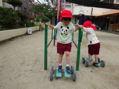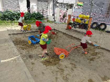 今日も良いお天気だったので、園庭で元気いっぱい遊びました!砂場では、「工事しているねん」と、一生懸命穴を掘ったり、砂を運んだりしていました。また、運動遊具にも興味を示し、挑戦する姿がありました。いっぱい遊べて楽しかったですね。