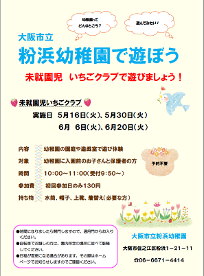 今年度は、5月から未就園児いちごクラブを実施します。ホームページの配布文書にもお知らせのチラシを添付していますのでご覧ください。