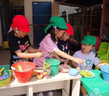 春探しをする中で、ブロッコリーの花に気付いた子どもたち。花を摘んで花束をつくったり、透明のカップに飾ったりして遊んでいました。また、ごちそうに見立てて「お花ケーキをつくるよ」「スープにもできそう!」と、見立てて遊ぶことも楽しんでいます。身近な自然物を取り入れて遊ぶ経験も大切にしていきたいです。
