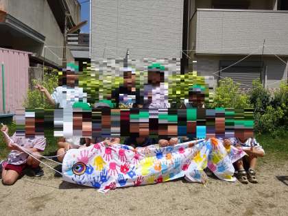 先日、みんなで手形をしてつくったこいのぼりが完成しました!良いお天気だったので、こいのぼりと一緒に写真を撮りましたよ。住吉公園に飾っていただく予定です。元気に泳ぐ、”粉浜幼稚園こいのぼり”を見るのが楽しみです!