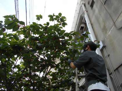 5歳児まつ組は、サクランボの木の近くまで行き、どんなふうにサクランボの実がついているのかを、間近で見ました。事業担当主事さんに枝を切ってもらい、「わー!すごい!いっぱいだね」と、サクランボの実がたくさんできているのを喜んでいました。