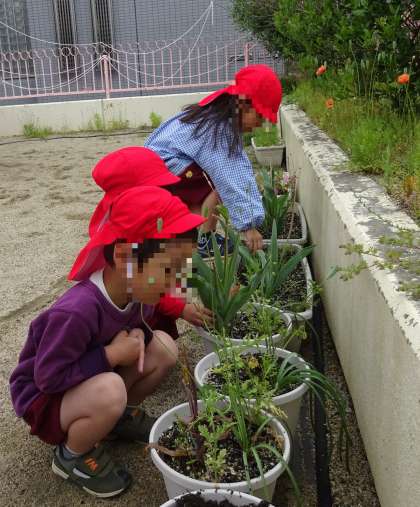 今日は、今週予定している苗植えの準備を子どもたちとしました。4月に咲いていたチューリップが終わりを迎えたので、チューリップ抜きをしましたよ。「なんか丸いのがあるよ」と、球根を見つけていました。次は、野菜を植えることを伝えると「楽しみ!」と、心待ちにする姿が見られました。