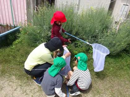 虫網を手に持ち、先生と一緒にそーっとなにかを見ています。チョウチョウを捕まえたようです。「かごに入れてみたいな」と言い、虫かごに入れると、嬉しそうに様子を見ていました。片付けの時間には「また遊びに来てね〜」と、お外に出しました。チョウチョウたちが粉浜幼稚園に遊びに来てくれるのを楽しみにしたいと思います。