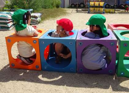 (写真下)カラーボックスを並べ、お家をつくっていました。中に入って、顔を出し、友達と目が合うと、思わずニッコリ笑顔な子どもたちでした。