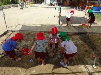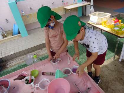 戸外に出ると、裸足になり、砂場で泥遊びを楽しんでいます。水を汲み、足にかけると「気持ちいい!」「冷たいね」と、気持ちよさを味わっていました。