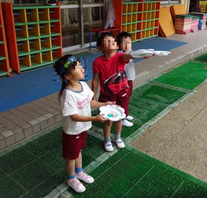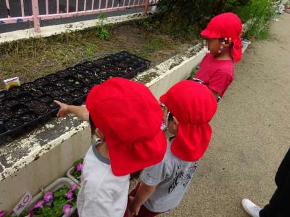 雨の日の楽しみ方を知った子どもたち。今日も「雨の魔法しよう!」と言い、コーヒーフィルターに絵をかいていました。昨日の経験から、どこから雨粒がよく落ちてくるのかに気付く姿がありました。また、先生の傘に入り雨の日の園庭を探検しました。先日、植えた種から芽が出ていたり、ミニトマトに実ができていたり、たくさんの発見がありました。雨の日も楽しいことをたくさん見つけた子どもたちでした。