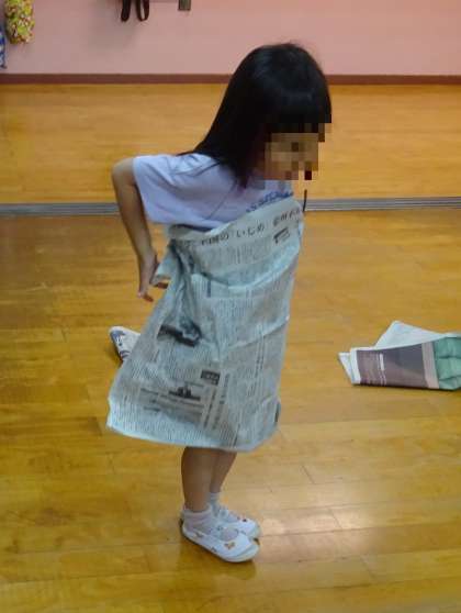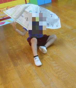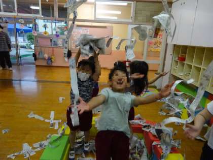 新聞紙を子どもたちに渡すと、思い思いに遊び始める姿がありました。「かくれんぼ!」と、体を隠してみたり、「洋服みたい」と、ドレスにしたり、子どもたちの発想の豊かさを感じました。また、新聞をビリビリ破いてプールをつくると「せーの!」と、声を合わせて、新聞紙シャワーを楽しみました。また、楽しい遊びを考えていきたいと思います。