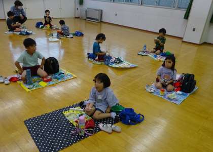 今日は、園外保育が延期になったので、遊戯室でレジャーシートを広げ、お弁当を食べました。子どもたちはとても嬉しそうでした。みんなで晴れたら、遠足に行くのが楽しみですね。