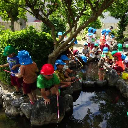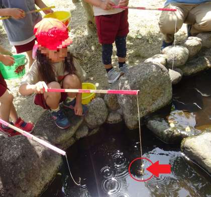 今日は、住吉幼稚園に行きました。住吉幼稚園の5歳児が出迎えてくれ、子どもたちも大喜び!ザリガニ釣りの約束を教えてもらい、ザリガニ釣りに挑戦しましたよ。最初は、なかなか釣れませんでしたが、住吉幼稚園の友達にコツを教えてもらい、釣れるようになりました!「わー!釣れたよ」「すごいね!」「ハサミがあるよ」と、大興奮でした。帰りに、ザリガニをいただき、大喜びの姿が見られました。