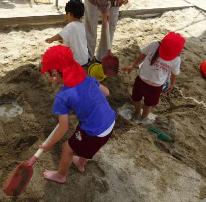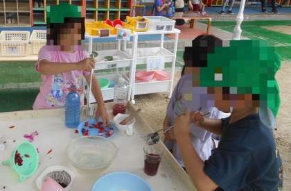 朝は少し雨でしたが、晴れ間が出てきたので、園庭でも好きな遊びをしました。色水遊びや泥んこ遊び、ボール遊びなど、自分の好きな遊びを見つけて楽しみました。色水遊びでは、いろいろな花やクワの実を使い、どんな色になるのか見比べる様子もありました。泥んこ遊びでは、水を流して道をつくったり、お山にトンネルをつくり、水を流してみるなど、自分なりに考えて遊ぶことを楽しんでいました。今の時期にしかできない遊びを、存分に楽しめるようにしていきたいと思います。