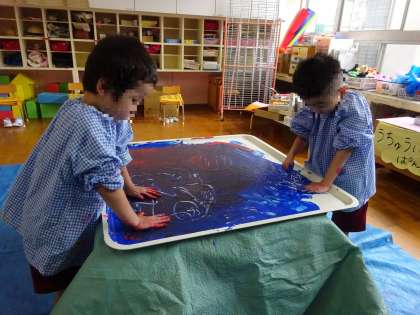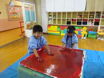 今日は、フィンガーペインティングをして遊びました。絵の具を手で伸ばすと「わー、気持ちいいね!」「むにゅむにゅしてる」と、感触を味わっていました。また、指で絵をかけることにも気付き「見て!顔、かいたよ」と、絵をかくことを楽しむ姿もありました。思う存分、遊んだので、腕も足も絵の具がいっぱいついていましたが、「いっぱいついたね」と、なんだか嬉しそうに話していましたよ。これからも伸び伸びと遊ぶことを楽しみたいと思います。